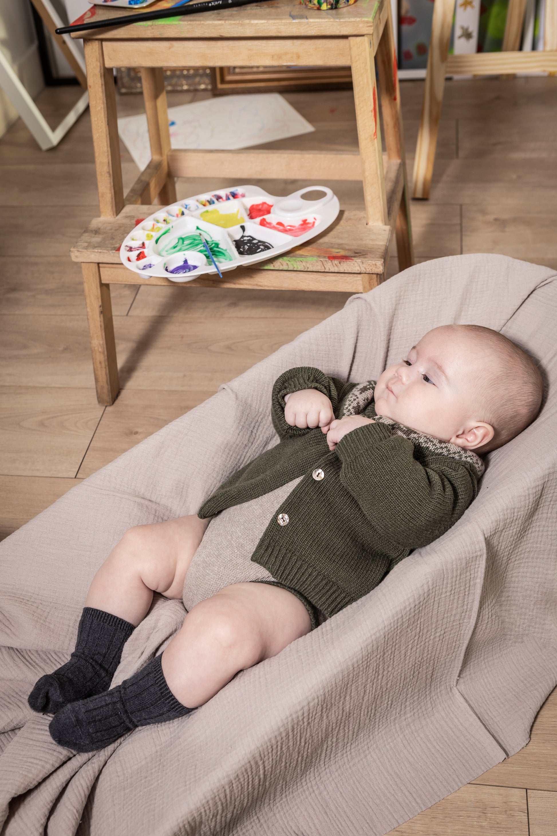 Composición: 30% lana merino, 30% viscosa, 35% poliamida y 5% cashmere. Botones nácar.